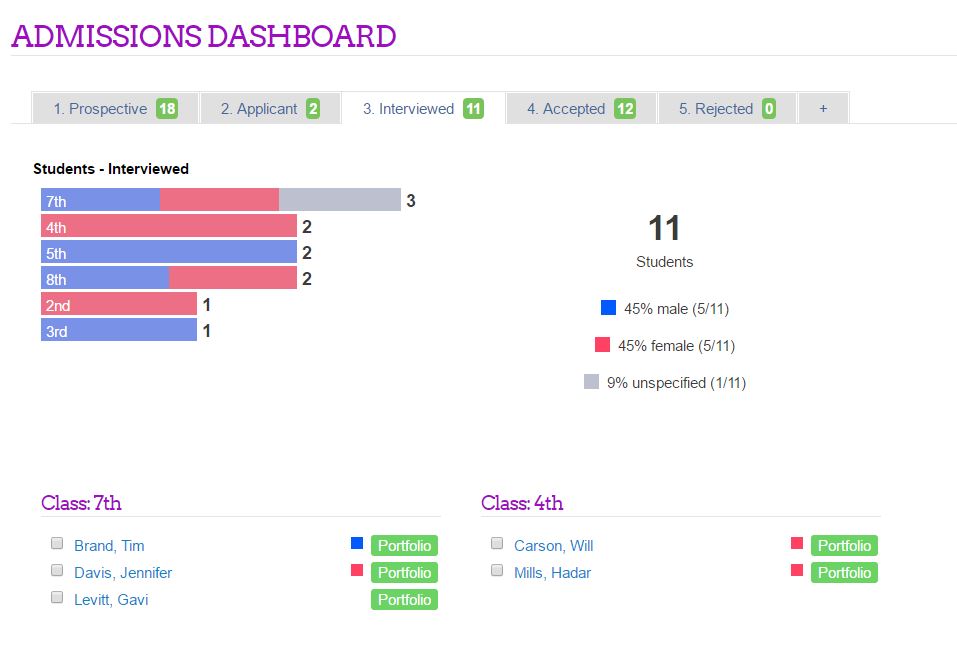 - The dashboard classifies students according to their status in your admissions process, for example, prospective, applied, interviewed, accepted, etc, as well as applying year and grade level.