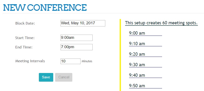 - Configure meeting times and dates as desired by setting start time, end time, meeting intervals, and setting any breaks.